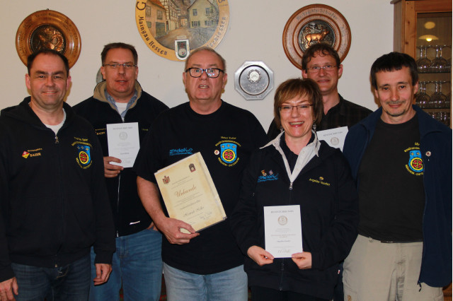 Thomas Baier zusammen mit den den ausgezeichneten Mitgliedern Gerrit Gratz, Heinz Keller (50 Jahre), Angelika Neudert, Ralp Trimborn und Garcia Domingo (40 Jahre) v.l.n.r.