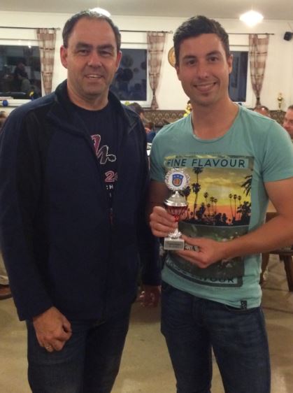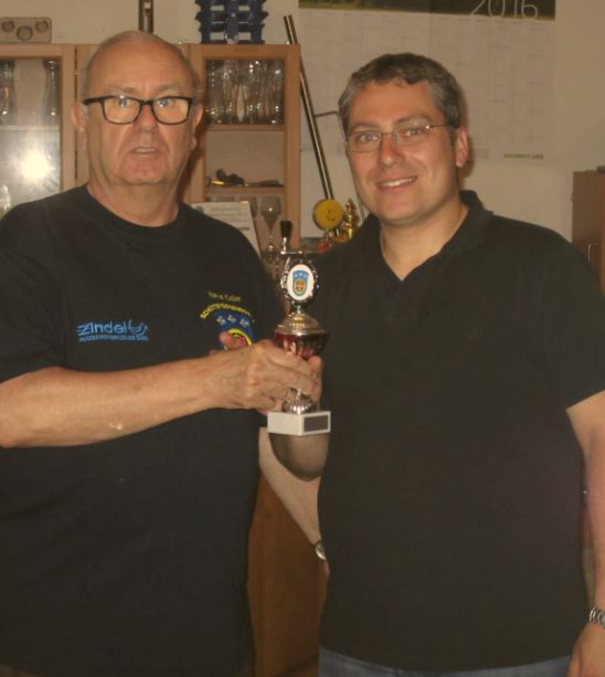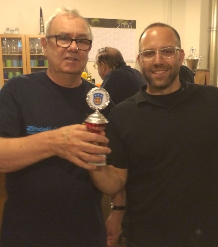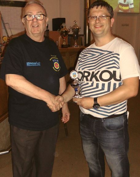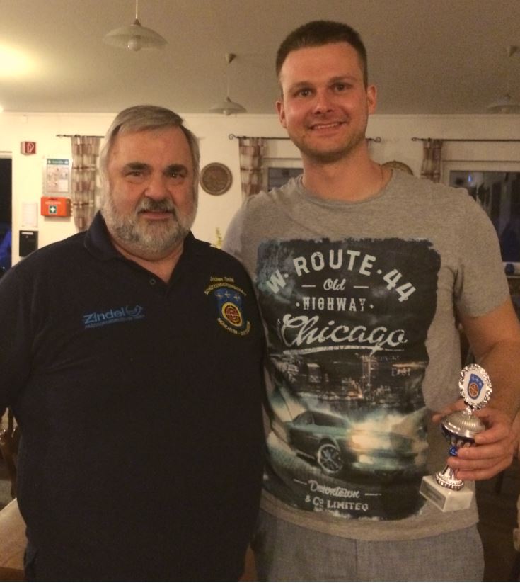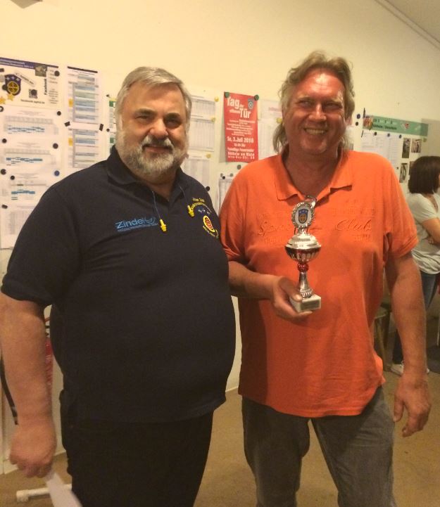 Der sportliche Leiter Jochen Zindel (l.) überreicht den Tagespokal an Michael Fraundorf vom Lämmerspieler Carneval Verein