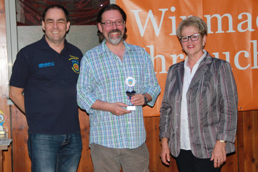 Stadträtin Erika Sickenberger (r.) und der erste Vorsitzende der Schützengemeinschaft Thomas Baier (l.) übergeben den Tagespokal an Claus Richert von den Sunday Dancing Stars